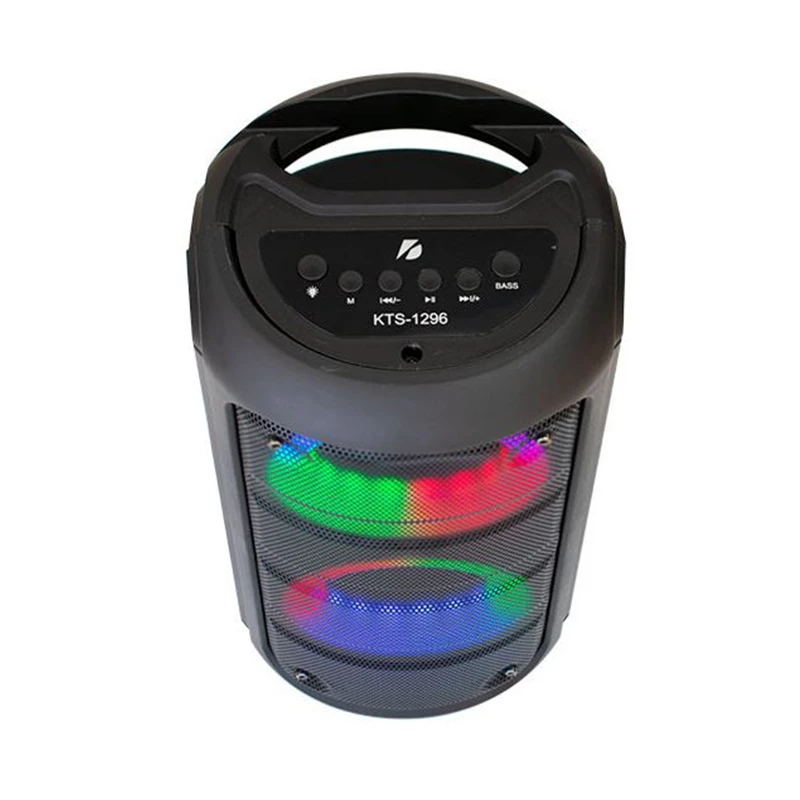اسپیکر بلوتوثی قابل حمل مدل KTS-1296، با توان خروجی 10 وات و ظاهر شیک و زیبا میتواند انتخاب خوبی برای گوش دادن و لذت بردن از موزیک دلخواهتان باشد. این اسپیکر دارای دو باند 3 اینچی و رقص نور است که هنگام پخش موزیک، زیبایی اسپیکر را دوچندان میکند. پشتیبانی از کارت حافظه و فلش مموری، بلوتوث، ورودی AUX و قابلیت اتصال میکروفون از ویژگیهای این اسپیکر قدرتمند است. این اسپیکر قادر است هم به صورت بیسیم و هم به صورت باسیم عمل کند. اتصال بیسیم دستگاه از طریق بلوتوث نسخه 5٫0 با برد 10 متر و اتصال باسیم آن از طریق رابط جک 3٫5 میلیمتری صدا امکانپذیر است. اسپیکر KTS-1296، از حافظههای جانبی رم microSD و فلش مموری USB برای پخش فایلهای صوتی ذخیره شده پشتیبانی میکند. شما میتوانید گوشی موبایل، لپتاپ، تلویزیون و سایر دستگاههای صوتی را از طریق عملکرد AUX Line-in از طریق کابل AUX متصل کنید. همچنین میتوانید موزیک موردعلاقه خود را روی فلش یا مموری ریخته و از طریق آنها اقدام به پخش صدای موردنظر خود کنید. این مدل مجهز به یک ورودی MIC است و با قابلیت اتصال میکروفونهای سیمدار، شما را در مراسم و سخنرانیها همراهی میکند. همانطور که در تصاویر آلبوم مشاهده میکنید، وجود جایگاهی برای قرارگیری گوشی موبایل در بالای باند جهت تماشای فیلم، موزیک ویدئو و … قابلیت جالبی است که شرکت سازنده برای این اسپیکر در نظر گرفته است. همچنین وجود دکمههای کاربردی روی باند به شما در کنترل امکانات اسپیکر کمک خواهد کرد. تامین انرژی این دستگاه از طریق باتری داخلی با ظرفیت 2400 میلیآمپر ساعت انجام میشود و مدت زمان موردنیاز برای شارژ دستگاه، حدود 4 ساعت است.