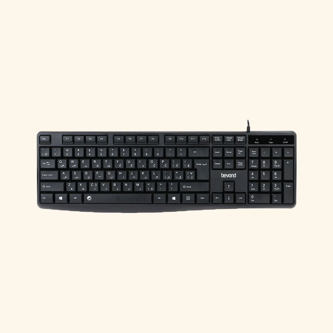 کیبورد «BK-3870» محصولی از برند «بیاند» یکی از زیر مجموعههای شرکت فراسو است که پیشینه خوبی در تولید لوازم جانبی رایانه دارد. این کیبورد از طریق یک کابل USB به رایانه متصل میشود و کاربر را در انجام فعالیتهای کامپیوتری همراهی میکند. طول این کابل برابر با 1.4 متر است که باعث محدود کردن کاربر نمی شود. جنس بدنه این کیبورد از پلاستیک با کیفیت است و میتواند در برابر بسیاری از ضربات مقاومت خوبی از خود نشان میدهد. تعداد کلیدهای کیبورد BK-3870 برابر با 104 عدد است. روی کلیدهای کیببورد بیاند مدل BK-3870 حروف فارسی چاپ شده تا کاربر به راحتی بتواند کلیدهای فارسی را از هم تشخیص دهد. روی کلید «اسپیس» این کیبورد لوگوی شرکت فراسو مشاهده میشود و در قسمت بالای Arrow Keys نام برند Beyond قرار گرفته است. اگر قصد تهیهی یک کیبورد با قیمت مناسب را دارید، مدل BK-3870 میتواند انتخاب مناسبی برای شما باشد.