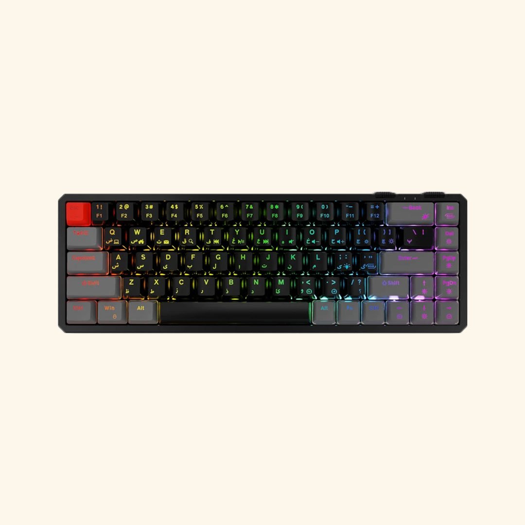 کیبورد گیمینگ مکانیکال 60 درصد فاطر مدل Fater KWR-8000B با طراحی مدرن و امکانات پیشرفته، انتخابی عالی برای گیمرها و کاربران حرفهای است. این کیبورد با 68 کلید و طراحی 60 درصدی، ترکیب کاملی از اندازه کوچک و عملکرد بینقص را ارائه میدهد. طراحی و دیزاین مدرن KWR-8000B با بدنهای از پلی کربنات ترمال پلاست و شاسی Premium Electrophoresis در دو رنگ سفید و مشکی، جلوهای شیک به میز کار شما میبخشد. ترکیب کلیدهای دورنگ و کلید قرمز، بههمراه حکاکی لیزری حروف فارسی و انگلیسی، استفاده و دوام بیشتری به کیبورد میدهد. طراحی ارگونومیک این کیبورد باعث میشود تا از تایپ و بازی بدون خطا لذت ببرید. اتصالات پیشرفته: سیمی، بیسیم و بلوتوثی KWR-8000B علاوه بر اتصال سیمی، به یک دانگل بیسیم با برد 12 متر مجهز است که اتصالی پایدار و سریع را برای شما فراهم میکند. همچنین، این کیبورد دارای بلوتوث 5 داخلی است که امکان اتصال همزمان به سه دستگاه مختلف را میدهد. با کلید Fn و زدن بلوتوثهای 1 تا 3، بهراحتی بین دستگاههای مختلف سوئیچ کنید. سوییچهای مکانیکال کمصدا و قابل شخصیسازی این کیبورد از سوییچهای مکانیکال Outemu قرمز با صدای کم استفاده میکند که برای بازی و تایپ بسیار مناسب است. تمامی سوییچها قابل تعویض هستند، به شما این امکان را میدهند هرکدام را که خواستید با سوئیچ های مدل دیگری تعویض کنید. نورپردازی RGB قابل تنظیم سیستم نورپردازی RGB پیشرفته این کیبورد، امکان شخصیسازی کامل نور هر کلید را فراهم میکند. میتوانید از 17 مود نورپردازی استفاده کنید یا رنگها را با تصاویر انتخابی همگامسازی کنید تا یک تجربه بصری منحصربهفرد داشته باشید. نرمافزار اختصاصی و ماکرونویسی با نرمافزار اختصاصی فاطر، قابلیت ماکرونویسی و تعریف کلیدهای ترکیبی فراهم است. این ویژگی باعث میشود در بازیها و برنامههای حرفهای، عملکرد بهتری داشته باشید. مناسب برای گیمرها و کاربران حرفهای KWR-8000B برای گیمرهای حرفهای و برنامهنویسان که ساعتهای طولانی به کارهای خود مشغول هستند، گزینهای ایدهآل است. طراحی ارگونومیک و امکانات شخصیسازی مانع خستگی و اشتباهات تایپی میشود.